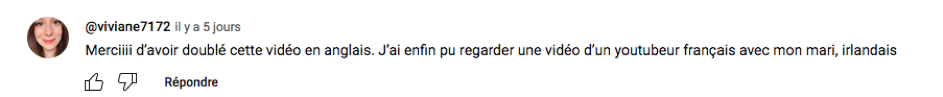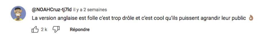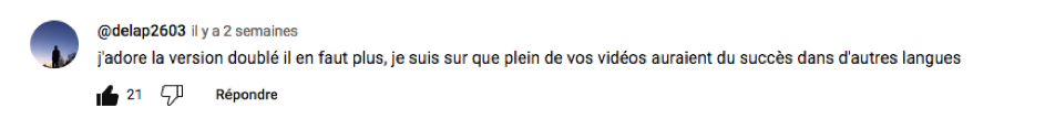 この動画は、アテナオが作成した英語吹替版を通じて、英語圏からの視聴数が倍増し「全く違和感なく、フランスのトップYouTuberの動画が楽しめた!」と、高い評価を得ています。