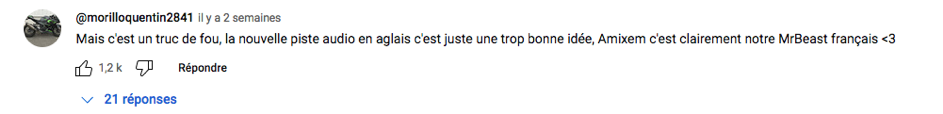 この試みはヤバい。英語の吹替音声を組み込むって、最高にアツい考えじゃない?アミクセムは明らかにフランスのMr.Beastだね❤️(このコメントに対して1200ライク、21コメント)